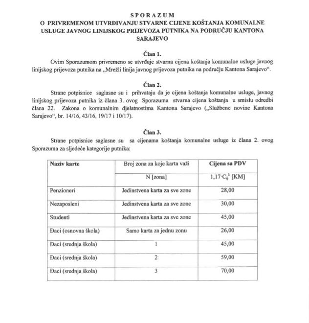 porazum kojim je bivši premijer KS dogovorio poskupljene GRAS-ove karte za nezaposlene potpisan je u januaru. Na sto novog ministra je došao tek u aprilu. Sada je juli i rješenja još uvijek nema, no prema riječima aktuelnog resornog ministra problem će biti rješen, a karte subvencionirane.Sporazum o privremenom utvrđivanju stvarne cijene koštanja komunalne usluge javnog linijskog prijevoza putnika na području Kantona Sarajevo kojim je sada povećana cijena karte za nezaposlene sa 12 na 30 KM potpisao je u januaru ove godine bivši premijer KS Edin Forto.