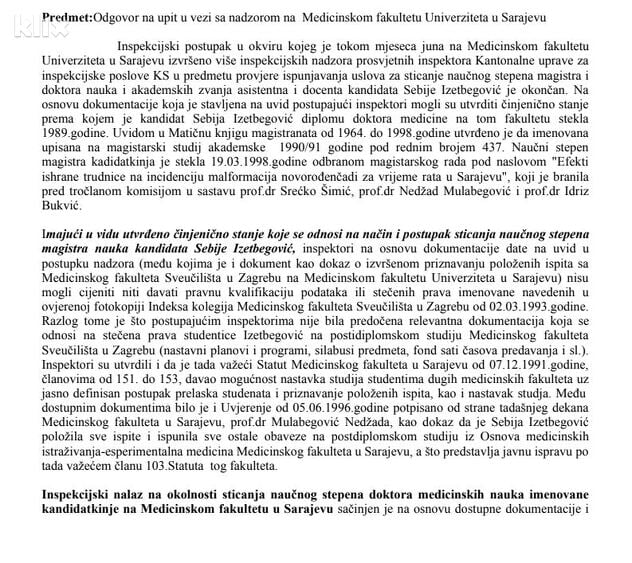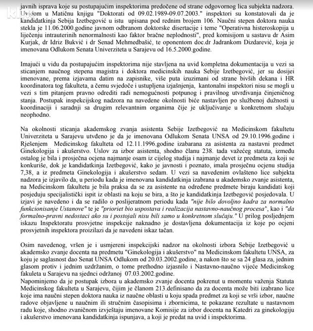 “Inspekcijski postupak u okviru kojeg je tokom mjeseca juna na Medicinskom fakultetu Univerziteta u Sarajevu izvršeno više inspekcijskih nadzora prosvjetnih inspektora Kantonalne uprave za inspekcijske poslove KS u predmetu provjere ispunjavanja uslova za sticanje naučnog stepena magistra i doktora nauka i akademskih zvanja asistentna i docenta kandidata Sebije Izetbegović je okončan.